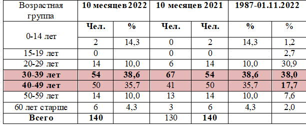 По кумулятивным данным (1987-01.11.2022) по прежнему преобладающее количество случаев ВИЧ-инфекции отмечено в возрастных группах 30-39 лет – 38,0% (926 человек), 20-29 лет – 30,8 % (751 человек).