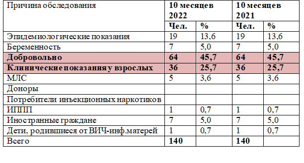 – По причинам обследования новые случаи ВИЧ-инфекции за 10 месяцев 2022 г. распределились следующим образом: изъявившие желание пройти обследования на ВИЧ добровольно – 45,7 %, клинические показания у взрослых – 25,7 %, эпидемиологические показания – 13,6 %, беременность – 5,0 %, иностранные граждане – 5,0 %, лица, находящиеся в местах лишения свободы – 3,6 %, дети, рожденные от ВИЧ-инфицированных матерей, и лица с ИППП – 0,7 % (Таблица 2).