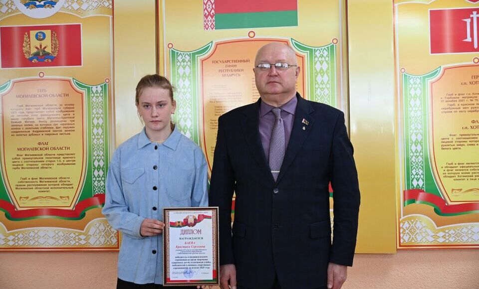 Олег Иванович вручил Диплом от Хотимского районного исполнительного комитета Кристине Баевой, учащейся 8 класса Забелышинской СШ, победительнице в индивидуальном соревновании среди творчески одарённых детей, отличников учёбы, победителей олимпиад и спортивных соревнований по итогам 2025 года.