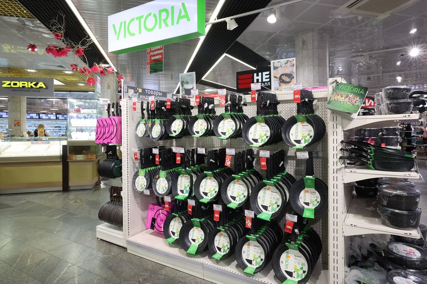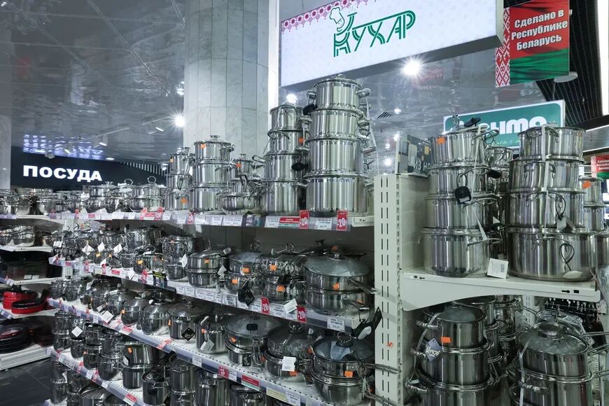Даже беглого взгляда по торговым залам достаточно, чтобы понять: дефицита товаров не наблюдается и сегодня. Но доступны ли они?Начнем прямо с первого этажа — с группы хозяйственных товаров. Весь май со вторника по воскресенье на посуду действует 50-процентная скидка. На сковороды, кастрюли и жаровни от частного унитарного предприятия «Виктория», а также на кастрюли от бренда «Кухар» скидка доходит до 20 %.