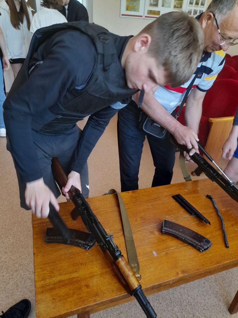 Большой интерес у ребят вызвали образцы специальных средств и оружия. Юноши и девушки смогли не только увидеть, но и подержать в руках милицейское снаряжение, с помощью которого раскрываются преступления, задерживаются преступники, осуществляется охрана общественного порядка: шлем, автомат, пистолет, специальный щит и многое другое.