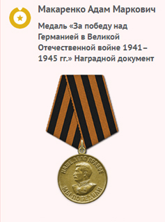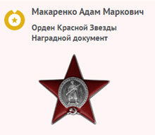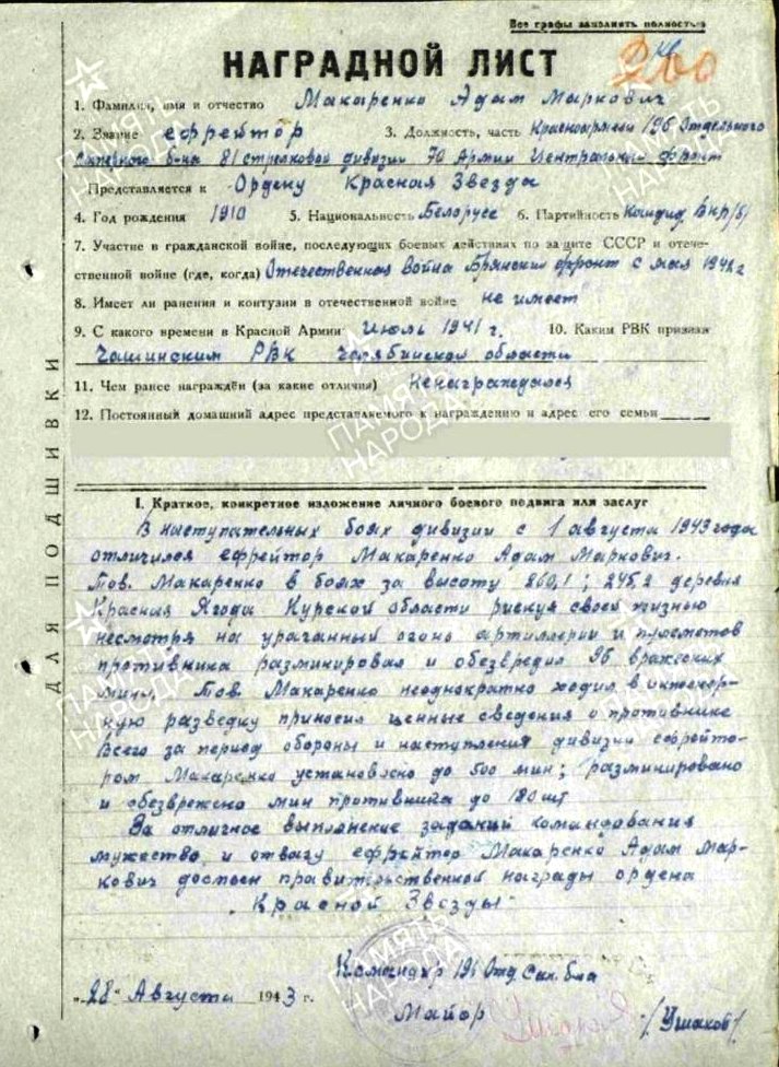 – Дедушка прошёл всю войну, – рассказывает Светлана Лапчевская. Я его помню плохо, была ещё маленькая, когда он был жив, а вот мой брат о нём знает больше, так случилось, что он некоторое время жил с ним и бабушкой в деревне Тростино, откуда и был сам родом, как и его родители. С детства помню рассказ о том, что Адам Маркелович встретил войну в д. Макеевка, что в Донецкой области, там он работал в шахте. На тот момент ему был 31 год. Ефрейтор был призван в ряды Красной Армии в июле 1941 года по документам в Чашинском РВК, Челябинской области. К сожалению, сейчас эти данные мы знаем из архивов, жаль, что, когда был жив дедушка, мы не запоминали таких мелочей. Он жил, как миллионы молодых людей того времени. Учился, занимался спортом, работал. Как и многие другие ветераны, вспоминать военные годы он не любил. Куда приятней было поделиться радостью Дня Победы. Как ликовали и плакали от счастья солдаты, как мечтали, что вскоре увидятся с семьями, обнимут любимых, родных и близких, – рассказывают внуки. – Служил в 196 отдельном сапёрном батальоне 81 стрелковой дивизии 70 Армии Центрального фронта. 28 августа 1943 года был представлен к Ордену Красной Звезды. В кратком, конкретном изложении личного боевого подвига для заслуг наградного листа указано (на фото): «В наступательных боях дивизии с 1 августа 1943 года отличился ефрейтор Макаренко Адам Маркович. Тов. Макаренко в боях за высоту 860,1; 245,2 деревня Красная Ягода Курской области, рискуя своей жизнью, несмотря на ураганный огонь артиллерии и пулемётов противника разминировал и обезвредил 96 вражеских мин. Тов. Макаренко неоднократно ходил в инженерную разведку, приносил ценные сведения о противнике. Всего за период обороны и наступления дивизии ефрейтором Макаренко установлено до 500 мин; разминировано и обезврежено мин противника до 180 шт. За отличное выполнение заданий командования, мужество и отвагу ефрейтор Макаренко Адам Маркович достоин правительственной награды ордена «Красной Звезды».