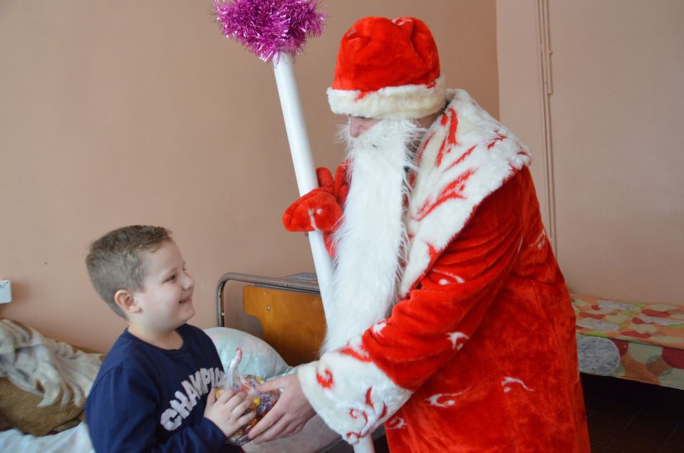Але, часам здараецца, што якраз напярэдадні навагодняй мітусні, некаторыя малышы трапляюць у дзіцячае аддзяленне Хоцімскай бальніцы. Каб маленькім пацыентам не прыйшлося сумаваць, прафсаюзныя працаўнікі ўстановы аховы здароўя кожны год ператвараюцца ў Дзядулю Мароза і Снягурачку і віншуюць рабят з надыходзячым святам.